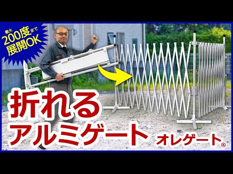 アルマックスの折りたためるアルミゲート『オレゲート』は、錆びにくいアルミ製で軽量、半分にたためてコンパクトに収納可能、持ち運びも簡単です。