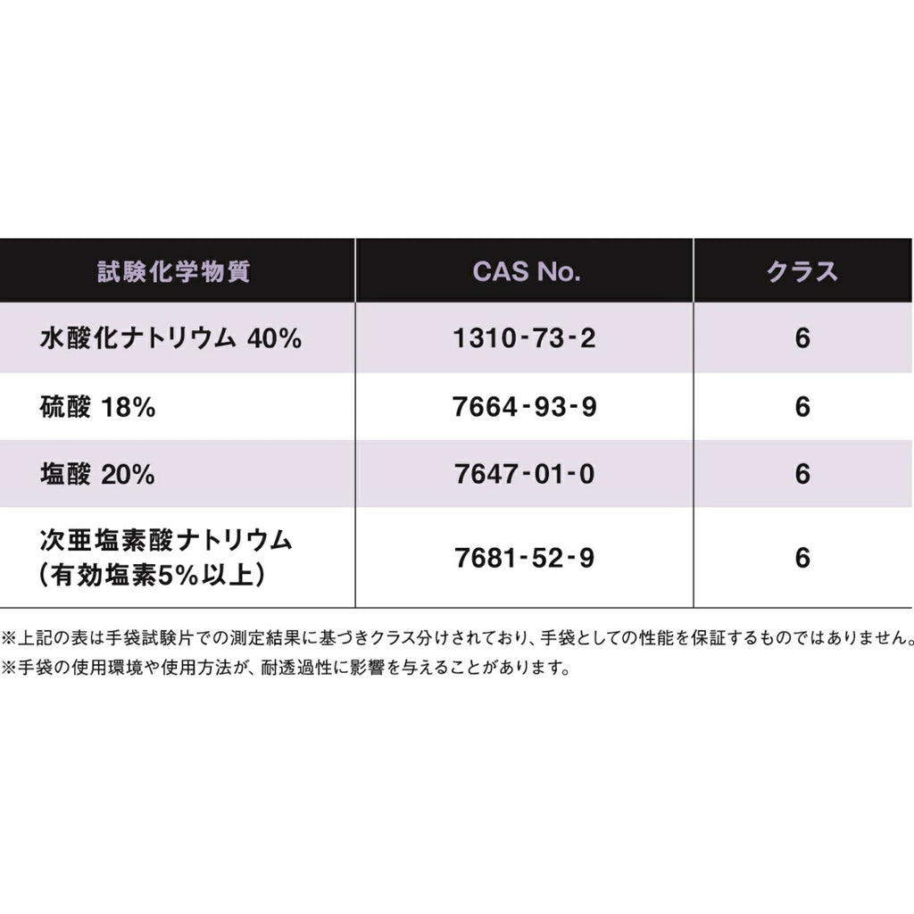 ●低濃度の酸性・アルカリ性薬品の透過を防ぎ、経皮吸収のリスクから作業者を保護します。
