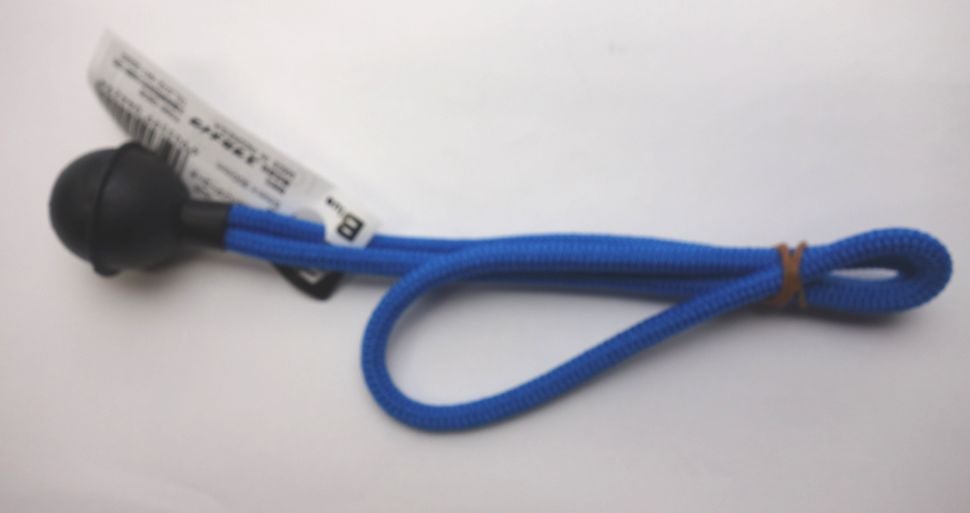 ボール型の留め金具付きの丸ゴムロープ。ロール状の物を束ねるのに非常に便利。
