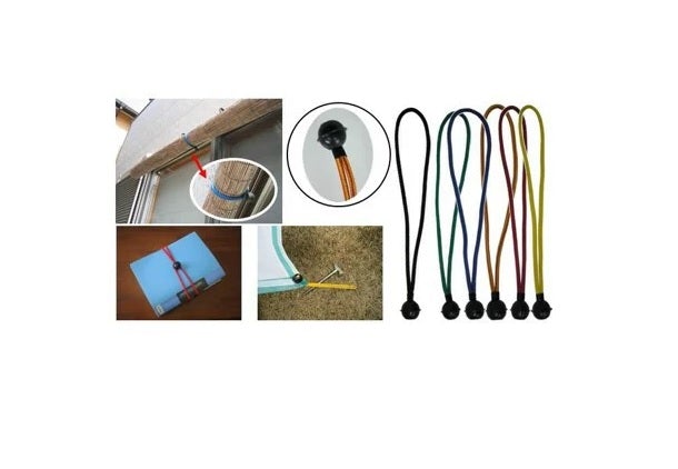 ボール型の留め金具付きの丸ゴムロープ。ロール状の物を束ねるのに非常に便利。