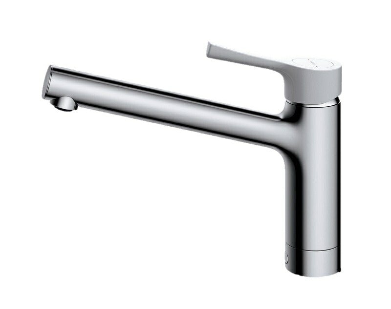 台所用シングルレバー混合水栓です。エコシングル水栓で、水とお湯の境目で「カチッ」とクリック感を設け、お湯の無駄使いを防ぎます。上面施工が可能で、シンクの下にもぐらずに上から取り付けできるので、一人での作業も楽にできます。