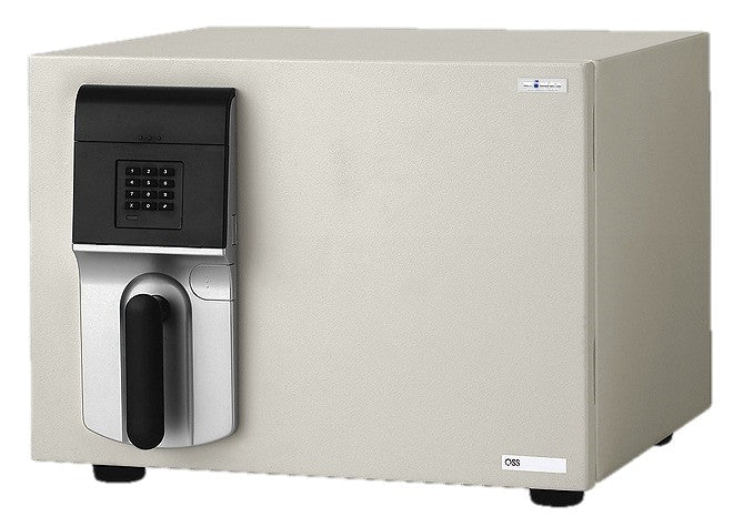 家庭用金庫のスタンダードサイズ。庫内上部には、カードや印鑑などの小物を収納するトレーが付属。