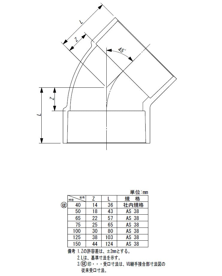 東栄管機 VU継手 45゜エルボ 呼び径75