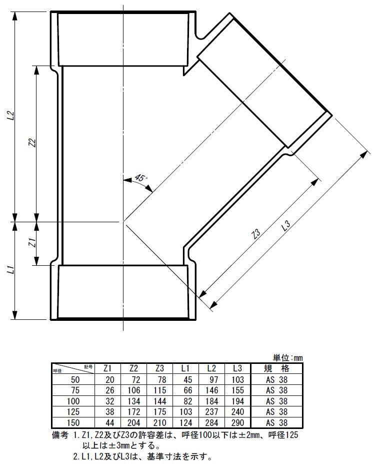 東栄管機 VU継手 45゜Y エルボ 呼び径75