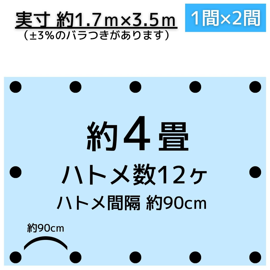 ■用途■土木建設業・農林水産業や養生、野積みカバーなどに。DIY作業やレジャー等の一般家庭用まで幅広く利用になれます。台風・水害等の災害備蓄用に。■ご注意■火のそばで使用しないで下さい。鋭利な突起物があたるとシートが破れる原因となります。素材:(本体)ポリエチレン、(ハトメ)ポリカーボネート実寸約1.7mX3.5m(±3%のばらつきがあります)畳換算面積(畳):約4ハトメ数:12ハトメピッチ(cm):約90