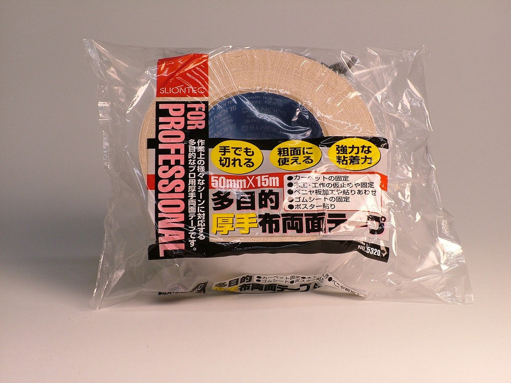 【製品特徴】・テープに厚みがあるため粗面にもよくなじみます。・また布基材ですので手で切ることも可能です。【用途】・カーペットの床面への固定・プロテクター固定用など補修用、工作用など【仕様】・テープ厚:0.50mm・幅50mm×長さ15m