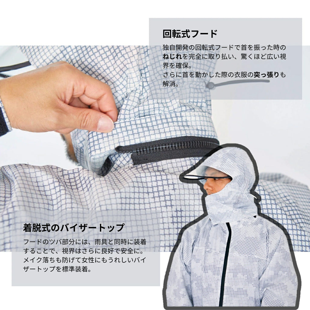 ●フードとボディ部分を分離した独自フードを搭載し、驚異的な視界を実現した革新的レインスーツ。アウトドアでも十分な防水透湿・軽量性を備えたTPUラミネート素材を採用し、革新的回転式フードと着脱式レインバイザーによって雨の日の自転車運転を驚くほど安全・快適に進化させました。収納してスタンドカラーにカスタマイズ可能なフード、洗練されたオリジナルカモ柄など普段使いのジャケットとしても自然に利用可能で、日常の通勤・通学・お出かけ・旅行からアウトドアまで幅広い用途で、1年中活躍してくれます。