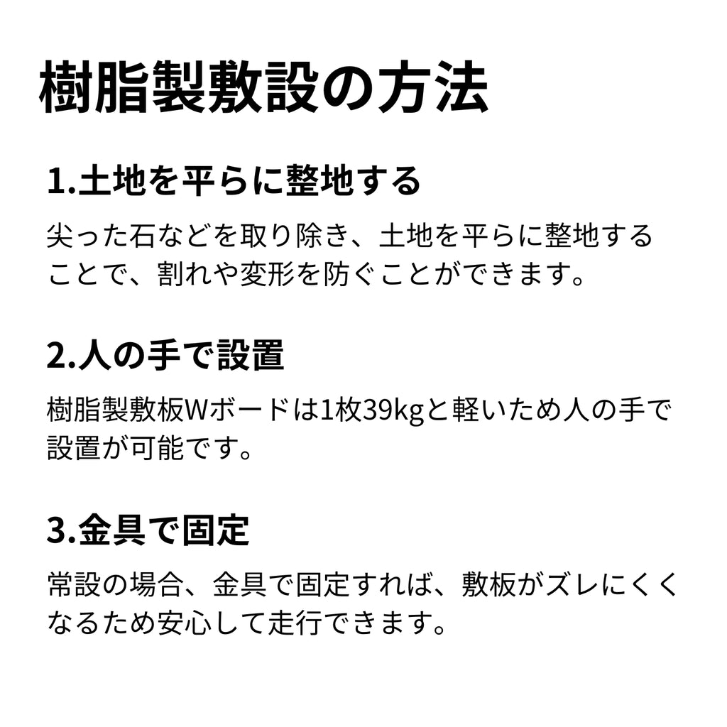 ●敷板を固定する場合はアンカーや杭で連結・固定、または番線を利用し敷板を連結、又は鉄板でWボードの端を敷き込むなどして固定して下さい。
